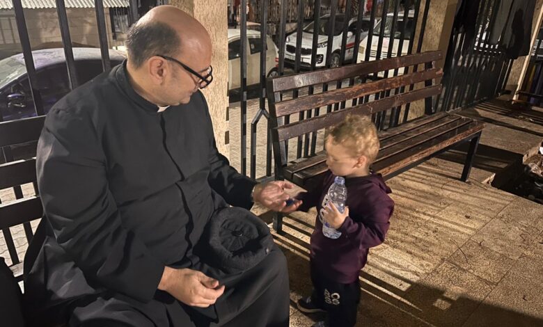 -Hay una realidad que es el hospital cristiano, que es el hospital anglicano, también llamado bautista, que está a unos 600 metros. Ahí se hacen algunas intervenciones. Ha sido bombardeado también más de una vez. Los directores son cristianos. Los directores y la gente que trabaja están refugiados acá. A la mañana pasan a recibir la bendición por la iglesia y después se van al trabajo, pero es un hospital grande. Los ayudamos llevando comida para los enfermos, para los heridos que están ahí internados. Aquí mismo en el predio tenemos como un dispensario interno, con un doctor, que en realidad está jubilado, pero es un flor de tipo, de esos doctores de pueblo. Visita a todos y él es el encargado de la farmacia interna. También tenemos un dispensario externo, en uno de los locales de la iglesia, que ahí hemos recibido y recibimos miles de personas del barrio. Entonces ahí sí está otro doctor, también de la comunidad cristiana. Después hay un enfermero, un chico, un joven musulmán, muy bueno, que los recibe. Tenemos un dentista, que también armó su consultorio, como pudo, ahí en otro localcito. Sí estamos preparando para hacer un hospital de campaña, que hace seis meses que estamos preparándolo. Pero todavía no hemos podido hacerlo entrar, porque eso viene del extranjero, por medio del patriarcado latino de Jerusalén y la Orden de Malta. Serían como clínicas. Empezaríamos con clínicas no móviles, pero serían como contenedores. Porque en esta parte de la ciudad, donde hay miles de personas, no hay ningún otro espacio