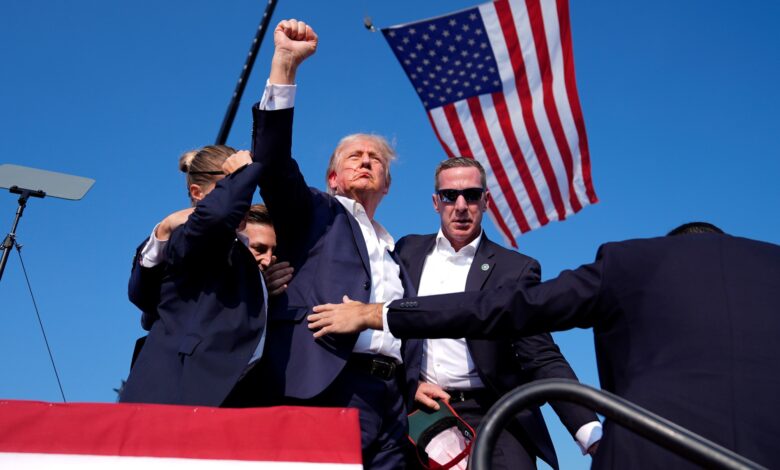La pintura captura las consecuencias de un atentado contra Trump durante un mitin en julio en Butler, Pensilvania. Trump recibió una herida en la oreja y alzó el puño al cielo mientras decía: «¡Lucha, lucha, lucha!».