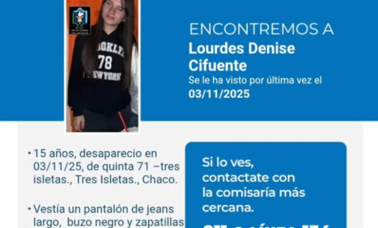 La Policía del chaco busca a Lourdes Denise Cifuente, de 15 años. Se la vio por última vez en Quinta 71, Tres isletas, este último lunes.