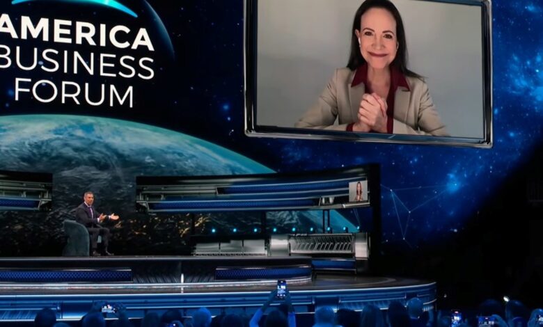 La premio Nobel de la Paz, María Corina Machado, fue una de las encargadas de abrir el America Business Forum en Miami. La dirigente venezolana habló vía Zoom, en una charla con el alcalde local Francis Suárez, y se refirió a su reciente galardón y a su reclamo por la libertad del pueblo venezolano, con duras críticas al régimen de Nicolás Maduro.
