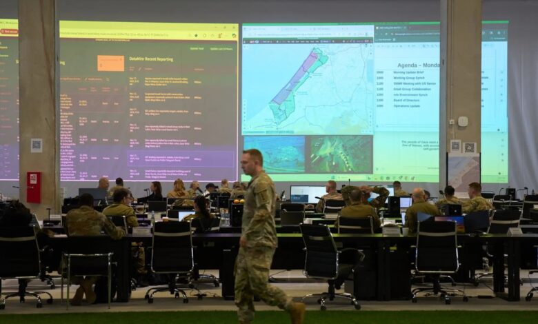 JERUSALÉN — En un destartalado parque industrial del sur de Israel, un enorme almacén de carga reconvertido bulle de actividad con cientos de soldados estadounidenses e israelíes, oficiales de inteligencia árabes, trabajadores humanitarios internacionales y diplomáticos y personal militar de toda Europa e incluso de lugares tan lejanos como Singapur.