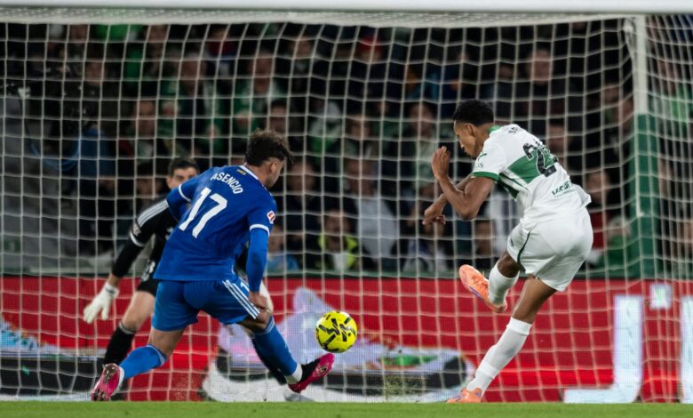La noche se presentó como un duelo de pizarritas, dos entrenadores a los que les encanta mover peones y estrujar el tablero. Los dos conjuntos en presión alta, emparejados uno por uno y una salida de balón que se convertía en un thriller. Cada acción se desarrollaba en el precipicio de una pérdida que hubiera resultado fatal. Quizá anticipándose a este cuadro, Xabi tiró de Ceballos y Arda Güler, sin ningún escudo al lado, para tratar de romper líneas con el pase, y arriba con Rodrygo. Sin embargo, entre tanto tacticismo y tanta flecha, el más cómodo era el Elche, el equipo de autor de Eder Sarabia.