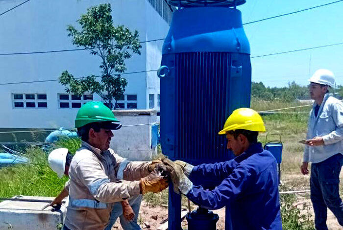 La empresa sanitaria, a través de las gerencias de Producción y Electromecánica, avanza en la instalación de una nueva bomba vertical de 1.000 m³/h destinada a reforzar la impulsión desde la cisterna de Presidencia Roque Sáenz Peña hacia la línea del Primer Acueducto del Interior, que abastece a Villa Ángela.