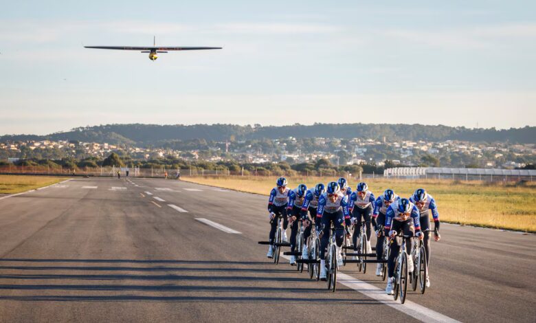 El 4 de diciembre, en la pista, 1.500 metros de perfecto asfalto, rodando contra el viento para facilitar el despegue, del aeródromo de Son Bonet, en Mallorca, nueve ciclistas del equipo Red Bull (Florian Lipowitz, Nico Denz, Jordi Meeus, Tim Van Dijke, Laurence Pithie, Adrien Boichis, Davide Donati, Callum Thornley y Gijs Schoonvelde: un ariete abriendo paso en la posición más dura y menos arriesgada, Lipowitz, y cuatro parejas detrás, teniendo cuidado de ir al mismo ritmo) pedalearon durante unos 90 segundos tirando del ultraligero, y a sus mandos, el experto piloto suizo de acrobacias Andy Hediger, un hombre pájaro, hasta que cuando alcanzaron 54 kilómetros por hora, el avión despegó suavemente y cortó la soga que le unía al tiro. Voló libre hasta alcanzar 100 metros de altura. Luego descendió. “Con unos 650 vatios por corredor durante 90 segundos, alcanzaron durante más de 30 segundos un máximo de 6.500 vatios colectivamente”, explica Bigham. “Ese día un par de ciclistas estaban fisiológicamente un paso por encima incluso de lo que pensábamos que estaban y aportaron bastante más vatios de lo que esperábamos y eso llevó al avión mucho más allá de lo que habíamos previsto. En los primeros ensayos, en el aeródromo del Hangar 7, no lo habíamos levantado más de dos metros y tuvimos problemas con los enganches. Se soltaban y se enredaban en las ruedas de los últimos del tiro. Fue peligroso”.
