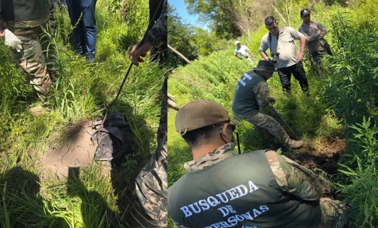 Alrededor de las 11, el perro de la fuerza «NAHLA», guió a los investigadores hasta un sector del campo lindante, donde a unos tres metros aproximadamente se encontró un pantalón color negro, tipo cargo, con bolsillos laterales, que se hallaba tirado entre las malezas.