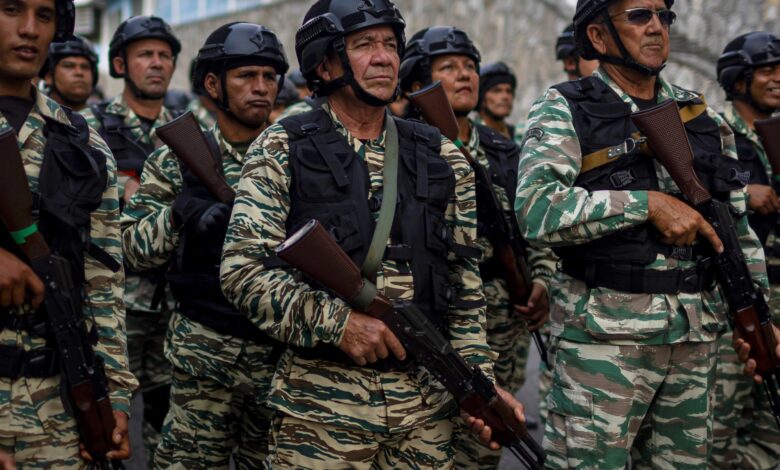 Integrantes de las milicias bolivarianas participan en un acto de juramento, en Caracas (Venezuela). Foto EFEEl discurso