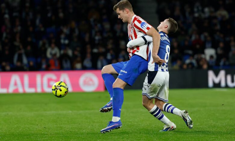 Mezclaba el Atlético el juego corto con el largo, con Sorloth metido de lleno al oficio de peinar balones y los centrocampistas rojiblancos acudiendo como lobos a las segundas jugadas. Julián Alvarez tuvo el gol tras un saque de esquina prolongado por Hancko en el primer palo. El argentino conectó una volea franca que se le fue arriba. La luminaria del Atlético volvió a inquietar a Remiro después de que Baena le templara una dejada. Esta vez no domó el control y la pelota se le quedó atrás y complicada de dirigir en el golpeo. La oscuridad ante la portería que marca los últimos meses del goleador argentino pareció mantenerse en el arranque del año.