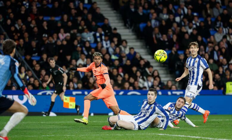 Alcanzada la media hora, la única noticia donostiarra fue un gol en fuera de juego en la jugada inicial del encuentro de Oyarzabal. La contienda giraba alrededor de Olmo y de Lamine, brillante como rematador y asistente, el último eslabón de un equipo con mucho ritmo y velocidad, seguramente uno de los más armónicos de la temporada, fiable incluso en defensa porque apenas concedía transiciones a la formación de Matarazzo, el técnico que fue vecino de Flick cuando ambos competían en la Bundesliga. El VAR volvió a anular un gol a los barcelonistas, ahora por un fuera de juego de Lamine. La superioridad barcelonista quedó sorprendentemente interrumpida por una llegada de la Real desde la banda derecha con Kubo y Guedes que acabó con una volea con la zurda de Oyarzabal que sorprendió a Joan García.