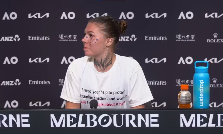 La tenista ucrania Oleksandra Oliynykova (Kiev, 25 años), apareció ayer en la rueda de prensa posterior al partido de primera ronda del Open de Australia en el que cayó derrotada ante la estadounidense y actual campeona del torneo Madison Keys (7-6(6) y 6-1), con una camiseta reivindicativa. “Necesito tu ayuda para proteger a los niños y mujeres de Ucrania, pero no puedo hablar de ello aquí”, decía la prenda, que al tiempo que pedía apoyo para su país, trataba de sortear la censura que el circuito femenino del tenis, la WTA, aplica desde 2023, a las preguntas o declaraciones políticas.