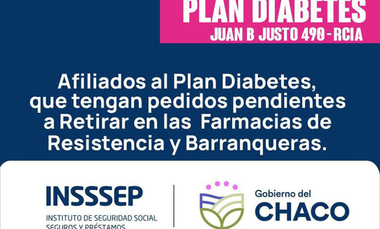 El Instituto de Seguridad Social, Seguros y Préstamos (InSSSeP) informa a sus afiliados incluidos en el Plan Diabetes que se registran 1.174 pedidos que no fueron retirados en las farmacias habilitadas de las localidades de Resistencia y Barranqueras.