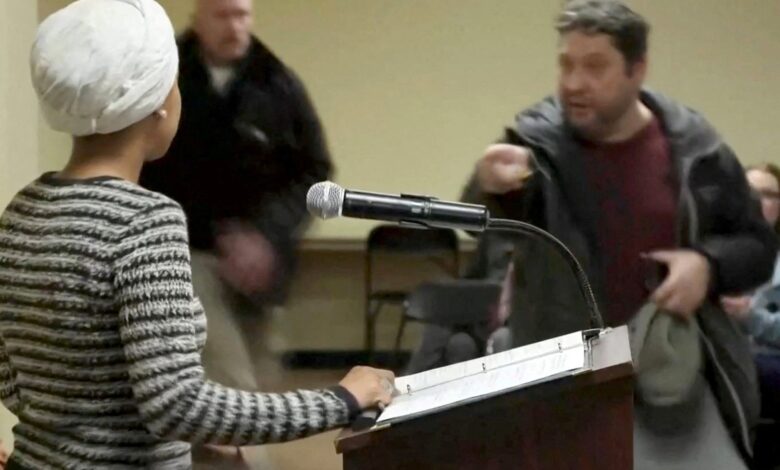 Tras pronunciar esas palabras, un hombre se levantó de la primera fila, hizo un comentario y roció a la congresista, mientras los guardias de seguridad se lanzaban a sujetarlo. Omar alzó el puño y dio un paso hacia el agresor antes de volver al podio.