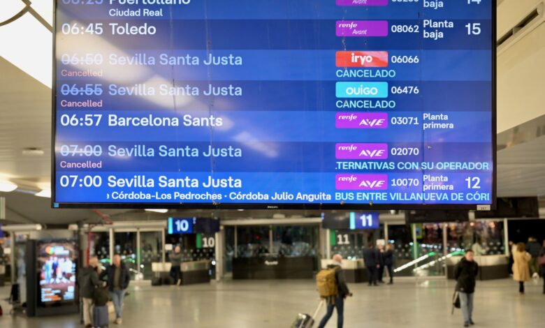 Sobre el fondo azul eléctrico de las pantallas que anuncian las partidas y los arribos, los trenes que suelen transitar las vías hacia Andalucía aparecen tachados. Al día siguiente de la tragedia, el ministro de Trasporte, Oscar Puente, prometió que para el 2 de febrero se restablecería el servicio.
