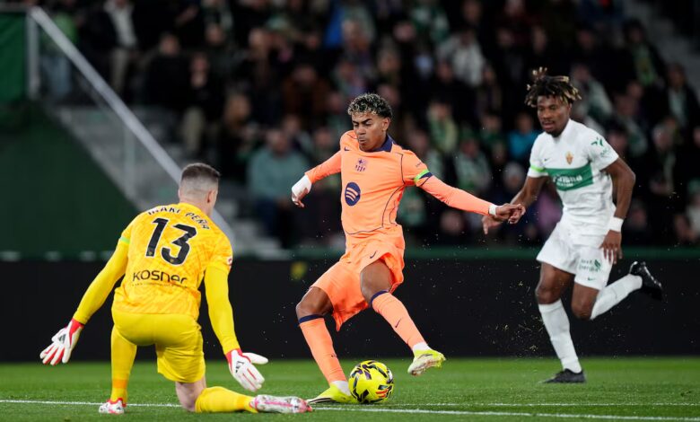 El Barça tardó más de una hora en finiquitar un partido que pudo resolver mucho antes del descanso en el expectante Martínez Valero. Los azulgrana se cansaron de fallar goles en un encuentro cuesta abajo por la condescendencia del Elche. La falta de tensión confundió al equipo de Flick, torpe en las dos áreas, también en la suya, como ya suele ser habitual, incapaz de ajustar las marcas y arropar a Joan García. La contienda parecía tan fácil que el Barcelona jugó con fuego durante un buen rato hasta que llegó el 1-3 después de la mediación de Lamine, el jugador que marca las diferencias en cada cita del líder de la Liga.