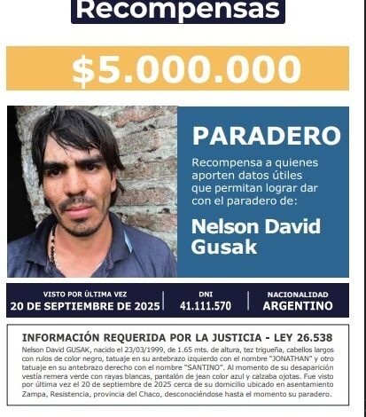 La desaparición de Nelson David Gusak, el joven de 23 años visto por última vez en Resistencia, continúa generando preocupación y mantiene en alerta a las autoridades provinciales y nacionales. A más de cuatro meses sin novedades concretas sobre su paradero, la Justicia y el Ministerio de Seguridad de la Nación ratificaron la vigencia de una recompensa de 5 millones de pesos para quienes aporten información clave que permita localizarlo.