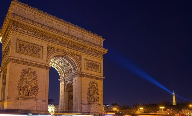 El Arco del Triunfo es uno de los sitios más famosos de París y se alza en lo alto de la concurrida avenida de los Campos Elíseos.