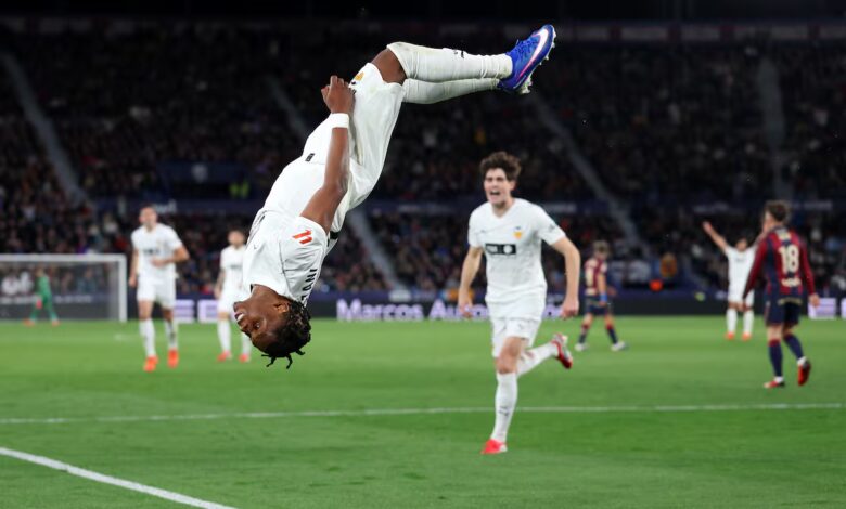 El golazo de Largie Ramazani, una flor en mitad del desierto en el que se convirtió el derbi, y la sentencia de Umar Sadiq al final del partido, le dieron un respiro al Valencia. El equipo de Carlos Corberán triunfa en casa del Levante (0-2) y consigue así subir cuatro puestos en la clasificación después de haber empezado el partido contra el Levante en puestos de descenso, donde se queda el conjunto de Luís Castro, muy disgustado con las decisiones del árbitro.