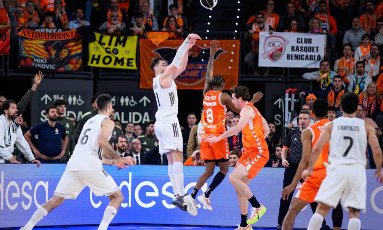 Scariolo apuraba los últimos trazos en la pizarra mientras los cinco jugadores del Valencia esperaban en la pista listos para la batalla final. La misión de Pedro Martínez ya estaba dictada y sus chicos mordieron en cada acción. El Madrid partía con dos bases, Campazzo y Feliz, frente a una batería exterior liderada otra vez por Montero. El dominicano puso patas arriba al pabellón con 12 puntos seguidos sin fallo, canastas de todos los colores, en el perímetro y a la carrera, mientras en el Roig Arena la afición del Barça se unía en los cánticos a la valenciana. La tensión se había disparado y en cada movimiento se decidía un trocito de final. Los blancos, una decena de puntos por debajo, se levantaron con los triples de un colosal Hezonja y el poderío de Tavares en los dos tableros. Fue entonces cuando Jean Montero decidió que era su momento y estiró su exhibición hasta dejar el partido visto para sentencia con ese 106-101 a falta de 20 segundos. O eso parecía porque Hezonja no había dicho la última palabra y el dominicano perdió un balón que concedió al Madrid la última bala. Mal negocio para cualquier rival porque el conjunto blanco no perdona cuando le perdonan. Súper Mario se elevó al cielo del Roig Arena con su séptimo triple de la tarde, récord copero igualado, para coronar una remontada para la historia, rendir a un enorme Valencia y alcanzar la final de la Copa. En tiempos en los que la Euroliga y la NBA se pelean por el control del baloncesto, la Copa regaló un espectáculo inolvidable.