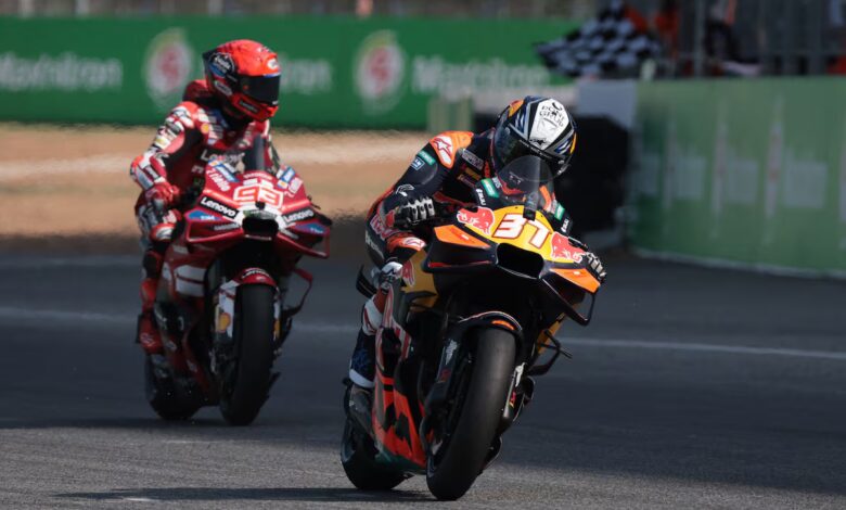 La primera carrera del curso en MotoGP se resolvió en la última vuelta y en la última curva tras una batalla preciosa entre el campeón del mundo y el chaval llamado a heredar su estrella algún día. El piloto murciano Pedro Acosta, de 21 años y bicampeón en las categorías intermedias, descorchó por vez primera el champán con los mayores después de un cuerpo a cuerpo espectacular con Marc Márquez en la sprint del GP de Tailandia, resuelta con una pizca de polémica tras una sanción de los comisarios al defensor del título. El pleno español en el podio lo completó Raúl Fernández con la Aprilia privada del equipo Trackhouse, aunque todos los focos se centraron en el ganador de KTM y el puntal de Ducati.