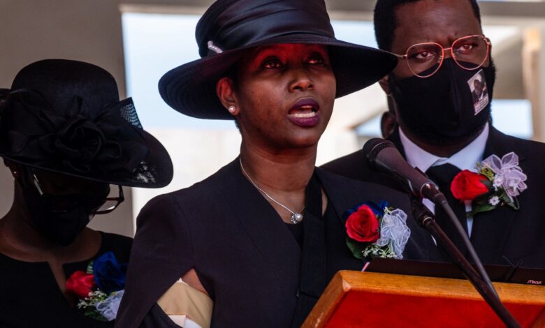 Martine Moise, hablando durante el funeral de su marido, Jovenel Moise, en Cabo Haitiano, Haití, en 2021. Federico Ríos para The New York TimesMartine Moïse habla durante el funeral de su marido, Jovenel Moïse, en Cap-Haitien, Haití, el 23 de julio de 2021. (Federico Ríos/The New York Times)