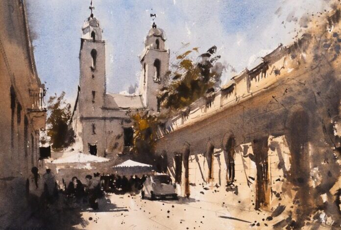 Las acuarelas de Canteros se sitúan en ese umbral donde la precisión del dibujo arquitectónico se encuentra con la atmósfera etérea del agua y el color, luces y sombras. Iglesias, capillas, oratorios y espacios de recogimiento emergen desde una mirada que no busca la representación literal, sino la evocación de lo intangible: la luz, la quietud del aire, la presencia humana frente a lo trascendente, lo sagrado.