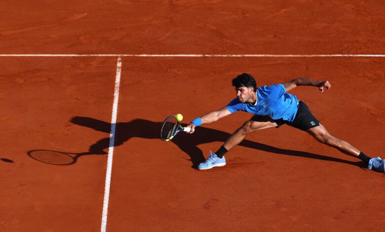No aprieta el calor, pero es un jueves de sudores en Montecarlo, donde las dos ruedas a seguir transitan sobre un terreno astilloso y áspero, lleno ortigas. Así va esto: la tierra es para los currantes, siempre hay que mancharse las manos. No existen los atajos. Si a mediodía sufría de lo lindo Jannik Sinner, indispuesto y arremangado para conseguir sacar adelante el pulso contra Tomas Machac (6-1, 6-7(3) y 6-3, tras 2h 01m), a media tarde es Carlos Alcaraz el que mastica y rumia el laborioso duelo con el argentino Tomás Martín Etcheverry. Pintaba muy bien la cosa, pero después se tuerce. Lo sortea finalmente el español, pero el segundo set ha sido feo: 6-1, 4-6 y 6-3, en 2h 23m. Un trago amargo.