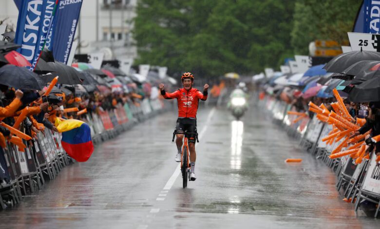 El amor al riesgo. Llega arrastrándose a Bergara, la meta final, pero llega vencedor. La Itzulia es suya. Su más joven ganador de la historia. Txapeldun orgulloso de la txapela que le distingue en el podio por delante de dos jóvenes con los que seguirá peleando los próximos años, Florian Lipowitz y Tobias Halle Johannessen. Luego, cambia la txapela por una gorra y acampa en el podio, donde recibe todos los maillots, el blanco de joven, el azul de la montaña, el verde de la regularidad.