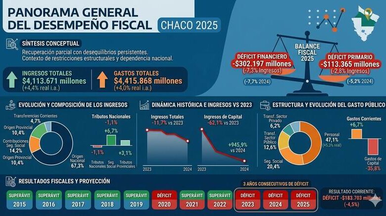 La provincia del Chaco cerró el ejercicio fiscal correspondiente al año 2025 con un escenario de recuperación parcial en sus cuentas públicas, aunque con resultados aún por debajo de los niveles alcanzados en 2023. De acuerdo con el informe sobre el Desempeño Fiscal elaborado por la Consultora Politikón, los ingresos totales registraron un crecimiento real interanual del 4,4%, mientras que los gastos totales se expandieron un 4,0%. No obstante, el balance final reflejó un contexto de restricciones estructurales que condicionaron la evolución financiera del Estado provincial.
