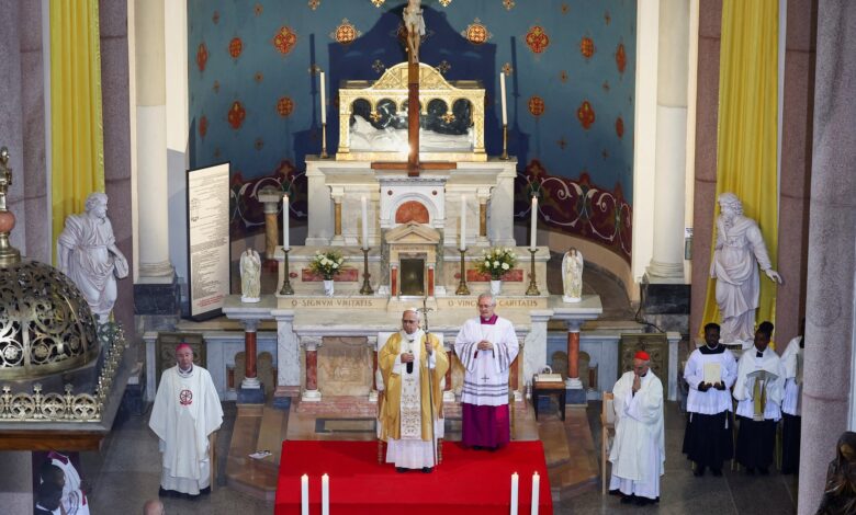 Trasmitió un mensaje de esperanza a pesar del difícil momento internacional en la misa que ofició por la tarde en la basílica dedicada a San Agustín en el área arqueológica.