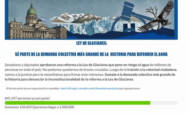 Organizaciones ambientalistas y de la sociedad civil impulsan una campaña nacional de recolección de firmas con el objetivo de presentar una demanda colectiva contra la reforma de la Ley de Glaciares, aprobada recientemente por el Congreso. La iniciativa, que ya reunió más de 840 mil adhesiones, busca alcanzar el millón de apoyos para respaldar una presentación judicial que declare la inconstitucionalidad de los cambios introducidos en la normativa y frene su aplicación en todo el país.