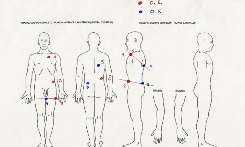 El análisis pericial incluye un esquema corporal que marca los puntos de impacto. Allí se identifican los orificios de entrada y salida distribuidos en el tórax, abdomen, zona lumbar y muslo izquierdo.