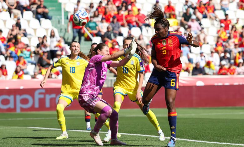 No había mejor respuesta para España a la derrota en Wembley que una goleada reparadora ante la floja Ucrania, una selección golpeada por la invasión rusa que asola su país desde hace más de cuatro años. La Roja, que al caer contra Inglaterra el martes se metió en un atolladero para lograr la clasificación directa al Mundial que solo da el primer puesto del grupo, se gustó esta tarde en Córdoba ante el combiando dirigido por Iya Andrushchak para maximizar sus opciones de estar en Brasil 2027 sin pasar por la repesca. La selección arrasó a su rival para igualar a las lionesses —ganaron 0-1 a Islandia en Reikiavik— en la diferencia de goles, un factor que puede resultar diferencial para determinar en junio quién lidera el grupo. El doblete de Edna, que lanzó dos martillazos canónicos con la cabeza, impulsó al equipo de Sonia Bermúdez. La delantera tiene un juego aéreo poderosísimo gracias al que ha marcado sus cuatro tantos como internacional desde que se incorporó al vestuario en noviembre. María Méndez, Vicky y Eva Navarro completaron en el tramo final la faena.