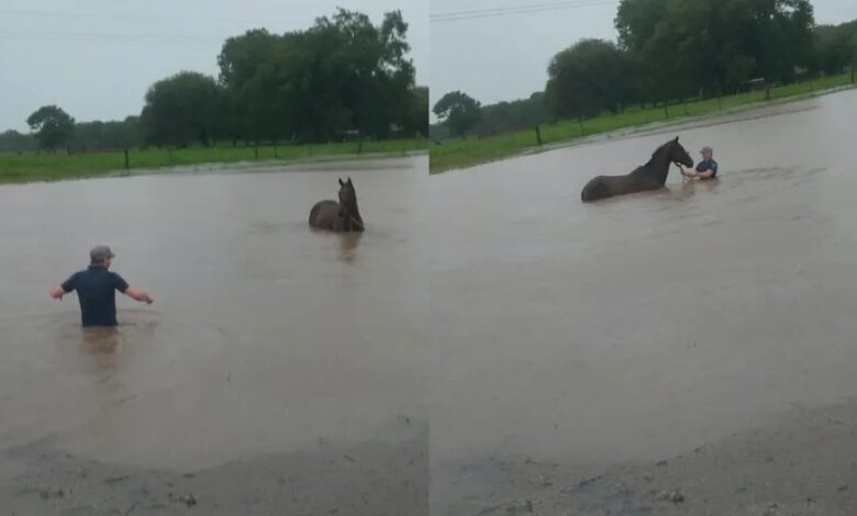 Este lunes, en medio de un fuerte temporal que afectó al interior provincial, en la localidad de Presidencia Roca la Policía logró rescatar a dos caballos que habían quedado atrapados por el agua y casi mueren ahogados.