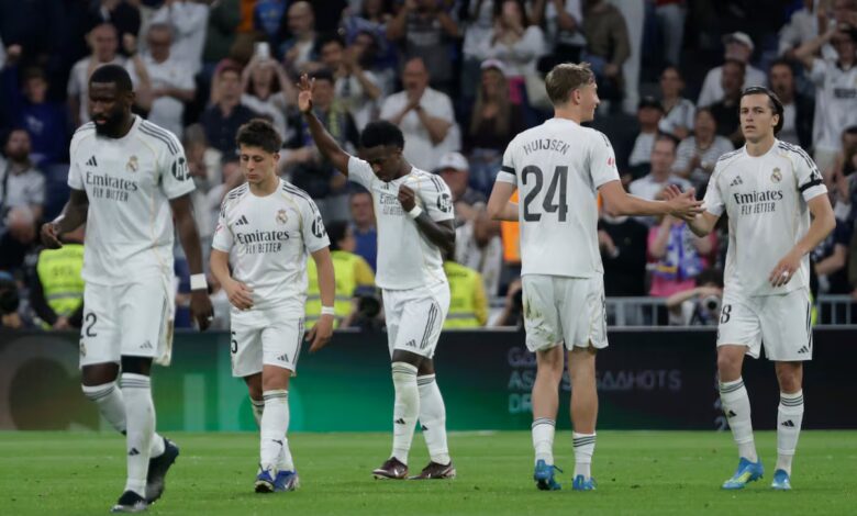 Todo el partido se jugó rodeado de un ambiente disperso, como de ¿para qué? Las señales, como cuando se avecina un terremoto, o un eclipse total, provocaban desconcierto. Para el Madrid se ha acabado todo, pero hay un montón de actores que tienen que conducirse como si no fuera así. Para empezar, los futbolistas, pésimos intérpretes del papel que les había adjudicado el día antes Arbeloa, cuando proclamó que les iba la vida en las siete jornadas restantes. Tampoco afinaba el graderío, que clareaba como nunca con la peor entrada del curso, 4.000 espectadores menos que la siguiente más pobre, contra el Getafe. En la tribuna baja de La Castellana casi se podía leer el “Real Madrid CF” escrito con el contraste de algunas butacas blancas sobre las azules. El grupo de animación probó a encontrar el entusiasmo disciplinado de siempre, pero cuatro filas más allá sucedió algo que les hizo perder el paso. Acudieron las asistencias a atender a un espectador y se quedaron mudos. Desaparecieron hasta los pitidos que acompañaron a las primeras acciones de Vinicius y Mbappé, apenas el único rastro de algún descontento al presentarse el Madrid en casa por primera vez después de haber perdido todo lo relevante por segunda temporada seguida. Se instaló el silencio, mezcla de congoja por el percance y desorientación por lo que sucedía sobre la hierba.