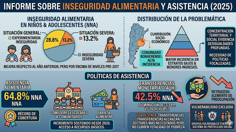 El informe también aborda la problemática de la inseguridad alimentaria, indicando que el 28,8% de los niños y adolescentes experimentó esta situación durante 2025, mientras que un 13,2% lo hizo en su forma más severa.