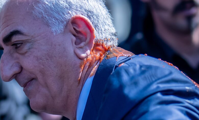 El príncipe heredero exiliado de Irán, Reza Pahlavi, fue salpicado con un líquido rojo este jueves al salir de un edificio en Berlín.